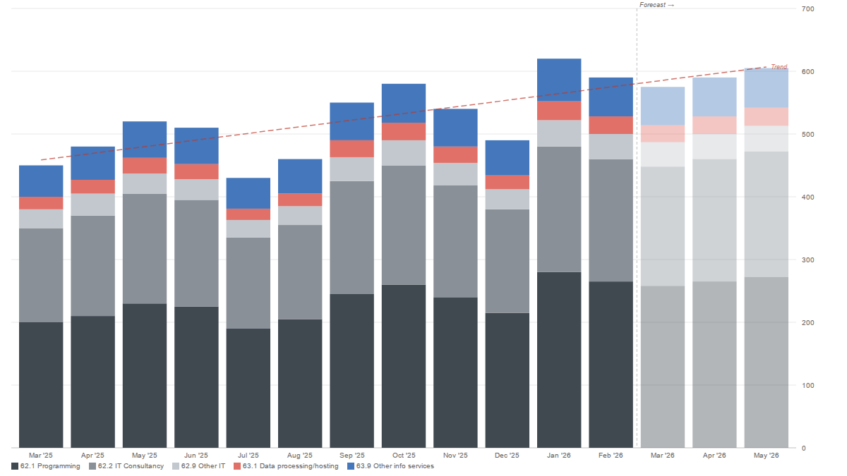 Monthly new tech company establishments in Norway (NACE 62.x + 63.x) from Bronnysundregistrene. Shows last 12 fully elapsed months.