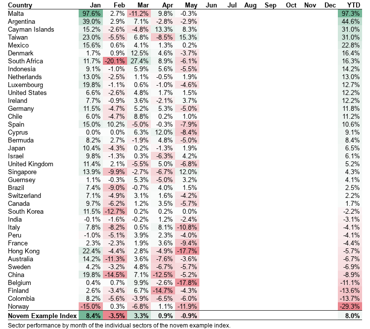 tb.caption = """Sector performance by month of the individual sectors of the novem example index.