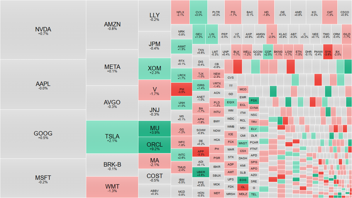 This interactive treemap shows the S&P 500 constituents sized by market capitalization and colored by yesterday's return. Each tile represents a company, with larger tiles indicating higher market cap and colors ranging from red (negative returns) to green (positive returns).