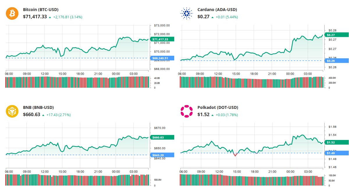 Dashboard showing Bitcoin, Cardano, BNB, and Polkadot price charts. Updated quarter-hourly (every 15 minutes) from CoinGecko API with real-time cryptocurrency price and volume data.