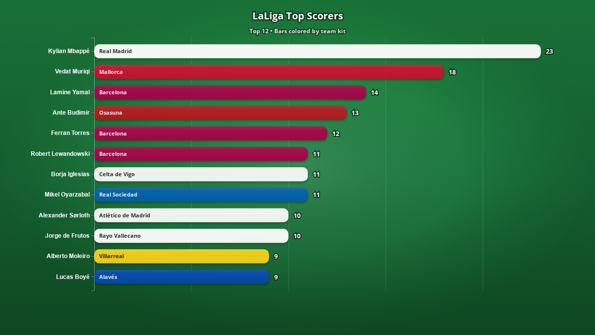 This visualization displays the current top goal scorers in LaLiga, highlighting the top 12 players based on total goals scored. The chart uses a horizontal bar layout to make comparisons between players clear and intuitive. Each bar is colored according to the primary color of the player’s club kit, providing an immediate visual connection between the player and their team.