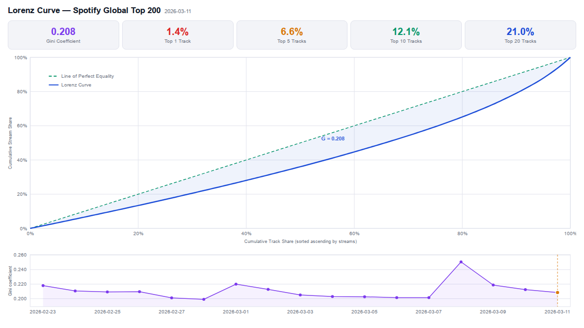 A high Gini (e.g. > 0.6) is typical for streaming charts — a small number of breakout tracks attract disproportionate attention while the long tail streams modestly. Tracking it over time reveals whether the chart is becoming more or less top-heavy, which can reflect seasonal effects, major album releases, or shifts in platform recommendation behaviour.