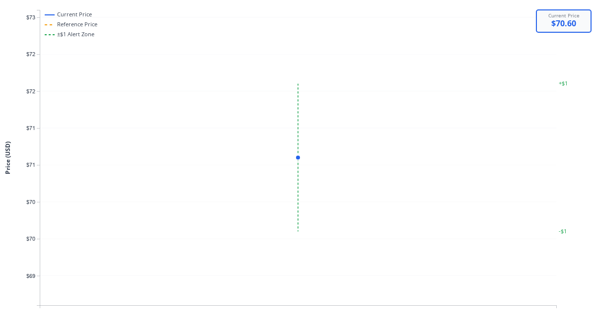 Monitors Brent crude oil prices and displays alert threshold bands. Green band shows the safe zone (±$1 from reference price). When price exits the bands, an email alert is triggered.
