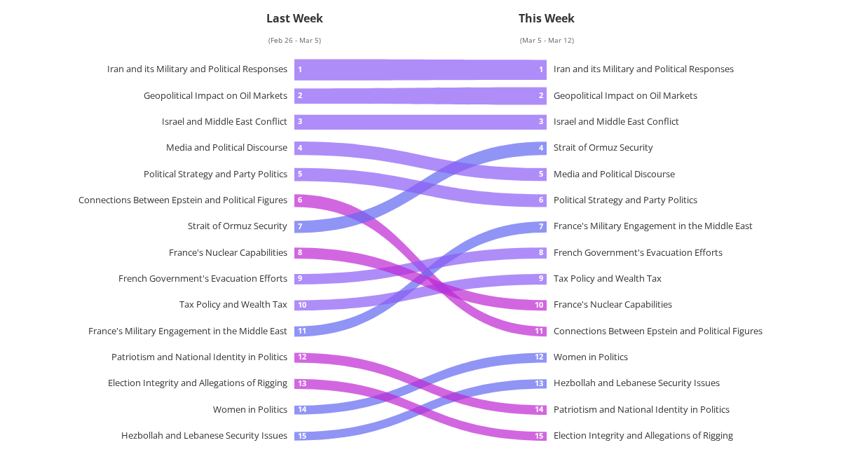 Tracks the top 15 US politics topics extracted from Gossip Insights podcast data. Topics are identified and ranked by mention volume across two consecutive 7-day windows, revealing how conversation trends shift from week to week.